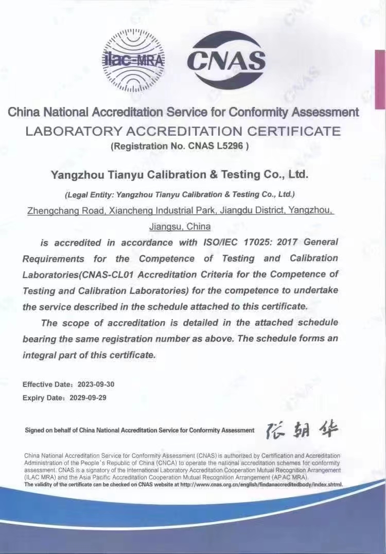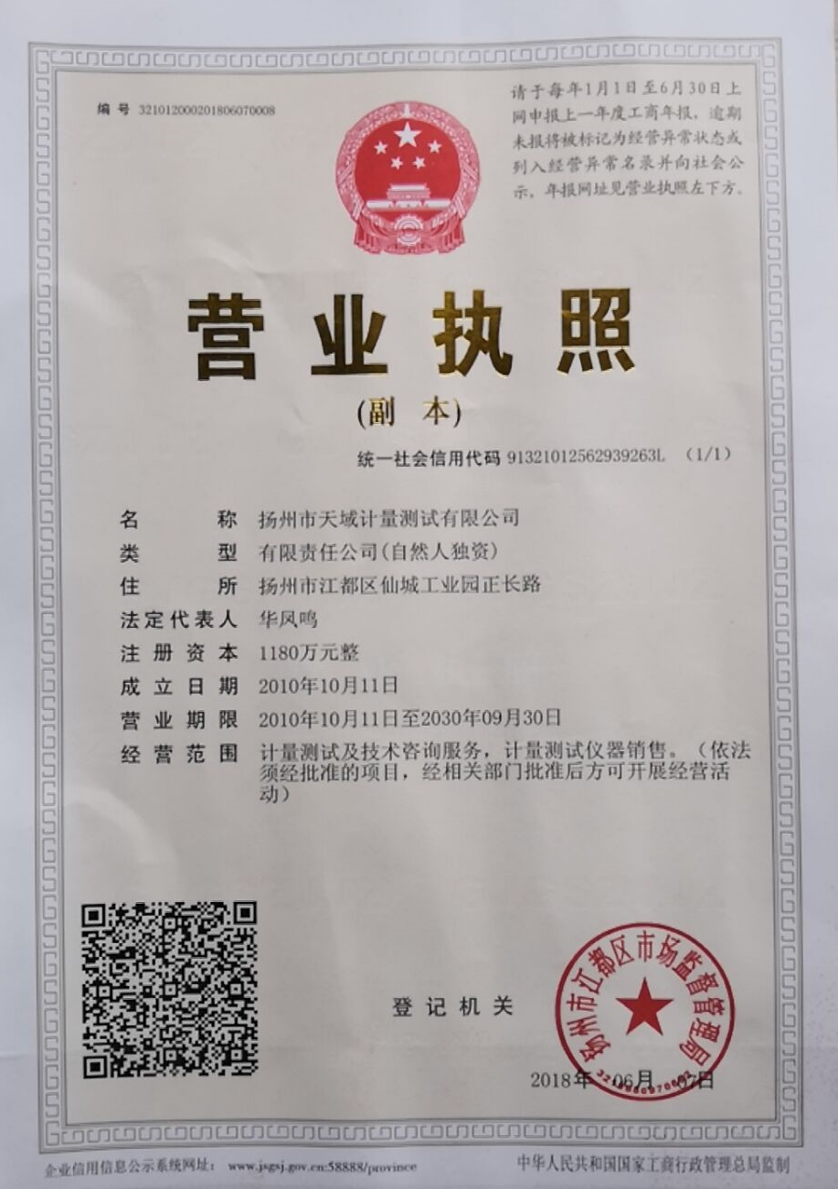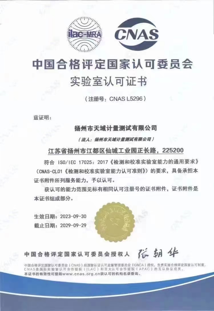 揚(yáng)州市天域計(jì)量測試有限公司,坐落在交通便利的揚(yáng)州市江都區(qū)仙城工業(yè)園,成立于2010年10月,2011年11月正式獲取中國合格評定國家認(rèn)可委員會認(rèn)可(授權(quán)),注冊號:CNAS L5296。近幾年的發(fā)展,實(shí)驗(yàn)室已具備了較大規(guī)模,并形成了集計(jì)量器具檢測,計(jì)量技術(shù)咨詢和計(jì)量器具銷售為一體的專業(yè)化技術(shù)機(jī)構(gòu),客戶覆蓋蘇南、蘇北、和浙江,安徽部分地區(qū),客戶群總量達(dá)到了上千家企事業(yè)單位。實(shí)驗(yàn)室建立健全了一套較為完整的內(nèi)外部質(zhì)量管理體系,至今未發(fā)生糾紛和客戶投訴事件。